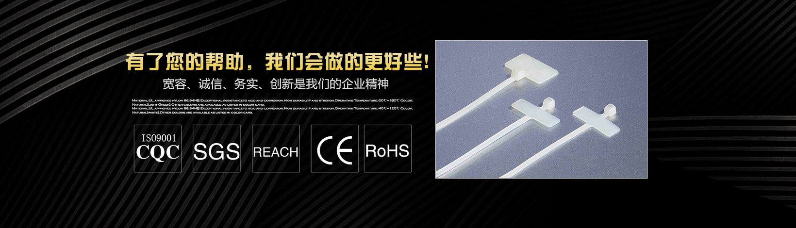 本公司專業(yè)生產(chǎn)銷售尼龍扎帶、特殊型扎帶、吸盤(自粘式定位片)、塑料膨脹管、尼龍壓線帽、電纜防水接頭、鋼釘線卡、R型線夾、飛機型線夾、瓷磚定位十字架、固定座、纏繞管、異型管、齒型管、號碼管、熱縮管、黃臘管、扎絲、鋼管蓋等系列產(chǎn)品。 我們擁有先進的檢測設備和雄厚的技術力量,并不斷優(yōu)化生產(chǎn)流程,規(guī)范生產(chǎn)環(huán)節(jié),加強完善質(zhì)量控制系統(tǒng),以優(yōu)異的品質(zhì)深得海內(nèi)外客戶的一致好評。